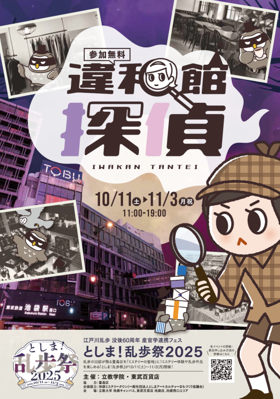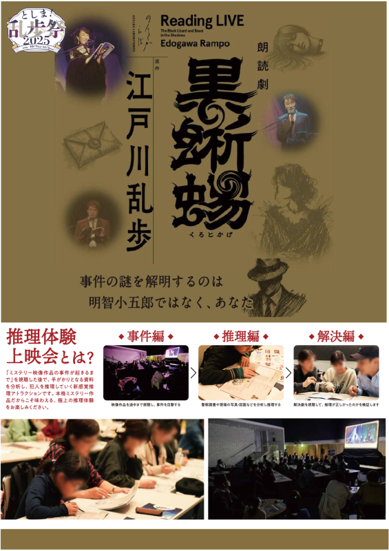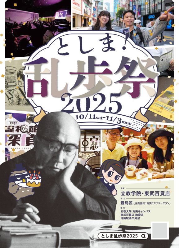 2025年10月11日(土)~11月3日(月・祝)に、江戸川乱歩の生誕月にあわせて『としま!乱歩祭』を開催します。立教大学、東武百貨店 池袋本店、池袋西口エリアで朗読劇やミステリー体験を楽しめるフェスイベントです。本イベントに、池袋ミステリータウンは企画協力をさせていただいております。