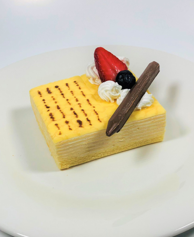 折り重なった小説の原稿をイメージしたミルクレープに、えんぴつチョコをあしらいました。文豪気分でお楽しみください。