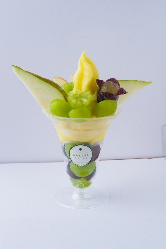 秋の旬の果物であるシャインマスカット、ラ・フランス、りんご、ぶどうを乗せた贅沢なパフェ。