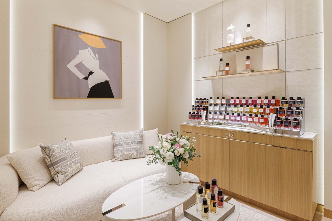 店内は、香水とクチュールの対話から生まれた「ラ コレクシオン プリヴェ」を中心に展開され、ラグジュアリーでありながら洗練された温かみのある光に満たされています。大理石の高貴さと洗練されたファブリックの繊細さが融合し、さらに漆喰とゴールドの輝きが織りなすモダンな空間は、メゾンのヘリテージや象徴的なファブリックにインスパイアされ、特別なフレグランス コレクションの世界を映し出します。「ラ コレクシオン プリヴェ」は、メゾンの歴史、想像力、そして受け継がれる美的コードからインスピレーションを受けた22種類のフレグランスをはじめ、ソープなどのボディケアアイテム、キャンドルを展開。