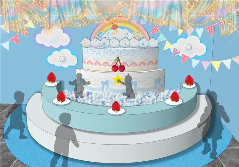 フィナーレエリアには、大きな「レインボーバースデーケーキ」が登場。生クリームをイメージした白いボールがたくさん詰まったボールプールには、中央の星形のライトを押すと光がきらめく楽しい仕掛けがあります。そして、シナモロールにプレゼントを渡して、パーティを締めくくります。