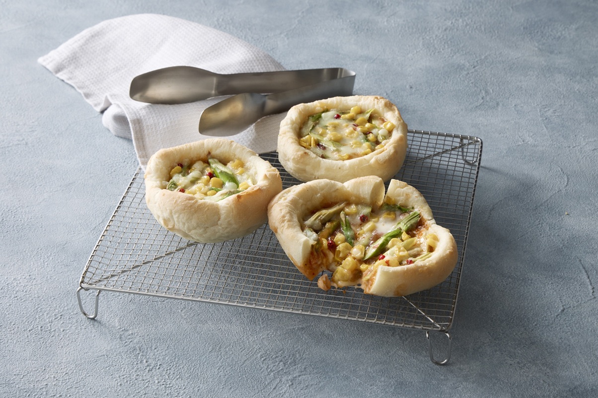 パンの器に、チーズ、ボロネーゼソース、南富良野直送アスパラガス、コーンを入れて焼き上げた東武限定パン。
