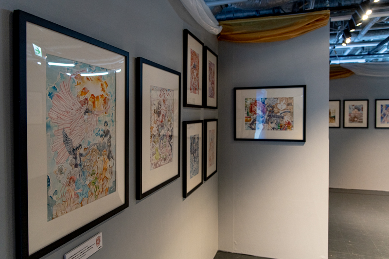 コスチュームエリアの次は、カラー原稿が大集合したエリアが広がっています。様々な手法を用いて描かれる種村先生のカラー生原稿。生き生きとした筆致を目に焼き付けることができました。